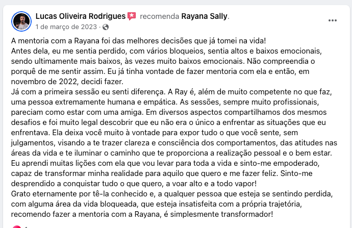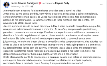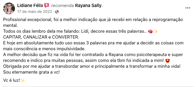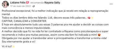 Desenvolvida por Rayana Sally através de metodologias comprovadas, onde a sua vida será mapeada desde a infância, para investigar e remover bloqueios que te impedem de prosperar e atingir o seu potencial.